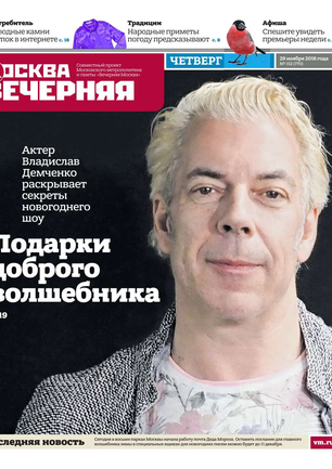 «Вечерняя Москва» — ежедневная российская вечерняя газета, старейшее из вечерних изданий в России, учрежденное в 1923 году. Выходит пять дней в неделю, кроме субботы и воскресенья. Отличается тем, что рассказывает о событиях еще не завершившегося дня. Оперативно освещает хронику и особенности жизни Москвы, охватывает все слои общества и большинство профессиональных и возрастных групп читателей.Издание представлено тремя выпусками – утренним ежедневным, вечерним (выходит три раза в неделю), еженедельным (выходит по четвергам).