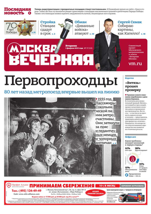 «Вечерняя Москва» — ежедневная российская вечерняя газета, старейшее из вечерних изданий в России, учрежденное в 1923 году. Выходит пять дней в неделю, кроме субботы и воскресенья. Отличается тем, что рассказывает о событиях еще не завершившегося дня. Оперативно освещает хронику и особенности жизни Москвы, охватывает все слои общества и большинство профессиональных и возрастных групп читателей.Издание представлено тремя выпусками – утренним ежедневным, вечерним (выходит три раза в неделю), еженедельным (выходит по четвергам).