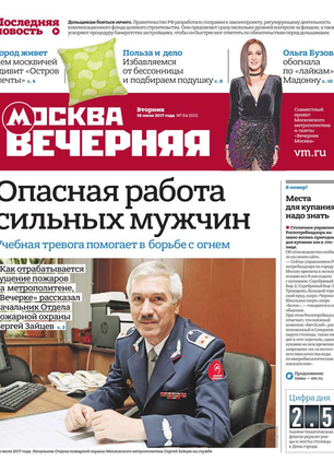 «Вечерняя Москва» — ежедневная российская вечерняя газета, старейшее из вечерних изданий в России, учрежденное в 1923 году. Выходит пять дней в неделю, кроме субботы и воскресенья. Отличается тем, что рассказывает о событиях еще не завершившегося дня. Оперативно освещает хронику и особенности жизни Москвы, охватывает все слои общества и большинство профессиональных и возрастных групп читателей.Издание представлено тремя выпусками – утренним ежедневным, вечерним (выходит три раза в неделю), еженедельным (выходит по четвергам).