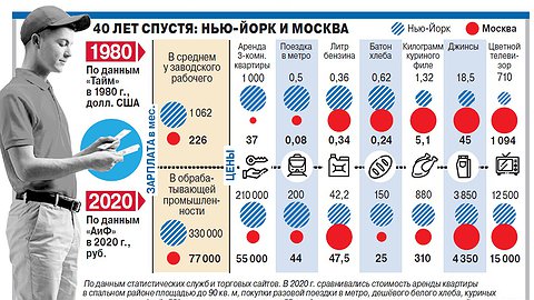 В советской Москве ожидаемо дороже, чем в Нью-Йорке, были джинсы, телевизоры и — неожиданно! — куриное мясо. Одежда и электроника до сих пор в российской столице могут стоить больше. С курятиной теперь всё наоборот (см. инфографику). А вот по зарплатам Москва Нью-Йорку как проигрывала, так и проигрывает, причём в разы. Что уж говорить про остальную Россию в сравнении с прочими Штатами.
