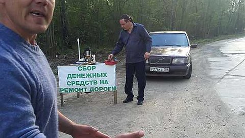 Установили самодельное объявление о сборе денег на ремонт дороги и упорно ее штопают на пожертвования проезжающих.