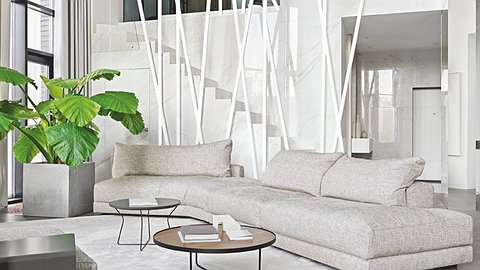 Пентхаус находится в загородном комплексе Flora&Fauna, расположенном на берегу Оби, буквально в пятнадцати минутах езды от города. С первого дня сотрудничества между владельцами квартиры и архитекторами Кириллом и Анной Дунаевой из «Дизайн– бюро №11» сложились тёплые и доверительные отношения, без которых никак, учитывая, что заказчики иногородние и что реализация проекта, совпавшая с периодом пандемии, проходила под чутким надзором авторов проекта, взявших принятие ключевых решений на себя. Хозяева этой необычной квартиры— успешная семейная пара с активной жизненной позицией, старший ребёнок которых уже живёт отдельно. Они придерживаются принципа Easy living, ценят качественные вещи и хороший дизайн. Собственно, все их основные предпочтения и легли в дизайн–концепцию проекта. «Мы стремились создать уютный и одновременно лаконичный интерьер, соответствующий образу жизни хозяев. Большие окна позволили впустить максимум света и воздуха и организовать общественные зоны на различные случаи—будь то семейный обед или шумная вечеринка с друзьями,—говорит Кирилл Дунаев.—Сейчас хозяевам непросто жить на два города—уезжать отсюда им совершенно не хочется».