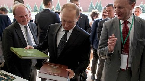 Ярославские издатели рассказали президенту о первой в России 30-томной серии, посвященной истории региона, его культуре, и подарили альбом "Святые ярославской земли".