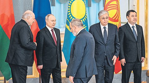 Утром Владимир Путин встречал президентов, которые должны были принять участие в заседании Высшего Евразийского экономического совета. В Большой Кремлевский дворец съехались премьер-министр Армении Никол Пашинян, президент Белоруссии Александр Лукашенко, президент Казахстана Касым-Жомарт Токаев и президент Киргизии Садыр Жапаров, председатель коллегии Евразийской экономической комиссии Михаил Мясникович, то есть все, кто накануне сидел на сцене во время пленарного заседания второго Евразийского экономического форума.