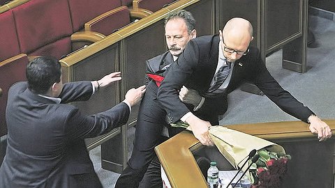 Яценюк кратко отчитался перед парламентом, после чего один из депутатов спровоцировал драку. Как выяснилось, инициатором инцидента стал депутат от «Блока Петра Порошенко» (БПП) Олег Барна. Президентский блок вместе с фракцией «Народный фронт» (НФ), а также фракциями «Батькивщины» и «Самопомощи» формируют правящую коалицию. Депутат «Самопомощи» Олег Березюк заявил, что считает эту драку спланированным спектаклем.