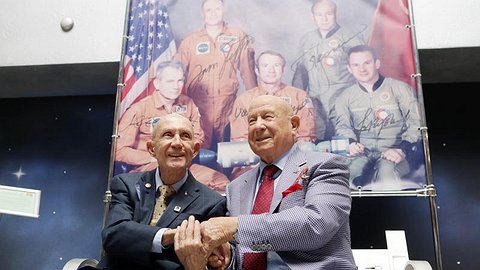 15 июля в Музее космонавтики произошла историческая встреча. Спустя 40 лет после легендарной стыковки кораблей «Союз» и «Аполлон» на околоземной орбите космонавт Леонов и астронавт Стаффорд снова пожали друг другу руки.