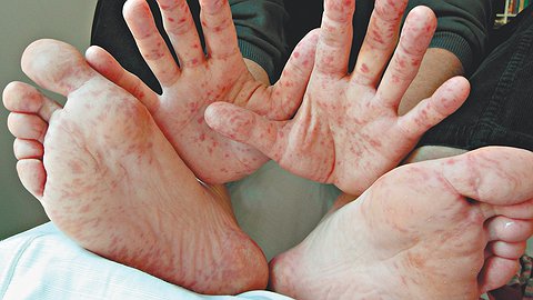 Вирус Коксаки часто описывают словам «рука-нога-рот»: это значит, что у пациентов обнаруживают болезненные пузырьки в полости рта, на задней стенке горла, на ладонях и подошвах стоп, реже – на задней поверхности голеней, бедер, ягодиц. Эти симптомы сопровождают также головные боли, ломота в теле, тошнота, першение в горле и другие признаки, которые легко перепутать с обычным ОРВИ. Иногда страдают глаза — развивается конъюнктивит. Впрочем, около половины заразившихся переносят инфекцию бессимптомно.