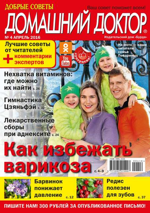 «Добрые советы. Домашний доктор» — это народный журнал о здоровье, уникальный и непохожий на другие издания медицинской тематики. А все потому, что основу журнала составляют письма читателей. В них авторы рассказывают свои истории исцеления, делятся рецептами народной медицины, проверенными на собственном опыте, просто обращаются друг к другу за помощью или дают советы тем, кто не может самостоятельно справиться со своим недугом.