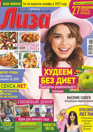 Самый популярный в России еженедельный журнал для молодых женщин «Лиза» стал еще интереснее, еще привлекательнее для читательниц. Теперь больше знаменитостей на страницах любимого журнала! Фитнес со звездой и звездный макияж, уроки стиля и самые горячие новости из жизни кумиров. А еще — модный шопинг, актуальная мода, новинки косметики и великолепные идеи для дома. Романтические истории о настоящей любви и рассказы читательниц о разных жизненных ситуациях. Аспекты психологии, секреты успешных отношений с окружающими и искусство сохранения любви.