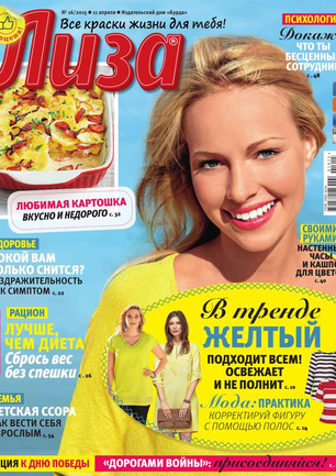 Самый популярный в России еженедельный журнал для молодых женщин «Лиза» стал еще интереснее, еще привлекательнее для читательниц. Теперь больше знаменитостей на страницах любимого журнала! Фитнес со звездой и звездный макияж, уроки стиля и самые горячие новости из жизни кумиров. А еще — модный шопинг, актуальная мода, новинки косметики и великолепные идеи для дома. Романтические истории о настоящей любви и рассказы читательниц о разных жизненных ситуациях. Аспекты психологии, секреты успешных отношений с окружающими и искусство сохранения любви.