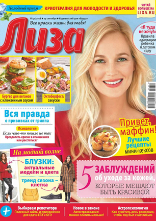 Самый популярный в России еженедельный журнал для молодых женщин «Лиза» стал еще интереснее, еще привлекательнее для читательниц. Теперь больше знаменитостей на страницах любимого журнала! Фитнес со звездой и звездный макияж, уроки стиля и самые горячие новости из жизни кумиров. А еще — модный шопинг, актуальная мода, новинки косметики и великолепные идеи для дома. Романтические истории о настоящей любви и рассказы читательниц о разных жизненных ситуациях. Аспекты психологии, секреты успешных отношений с окружающими и искусство сохранения любви.