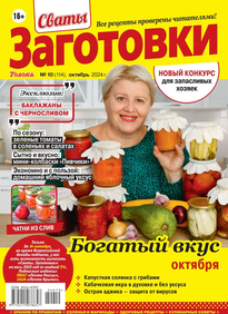 Более 100 рецептов заготовок от Сватов в каждом номере: соленья и маринады, салаты и ассорти, соусы и приправы, заготовки к сезону, сладкие заготовки, напитки, винный погребок, мясные деликатесы, здоровые рецепты, целебные заготовки, дачные хлопоты, правила хранения, а также кроссворды и сканворды для досуга. Лучшими рецептами поделятся с вами сваты Любовь Сергеевна и Михаил Михайлович.
