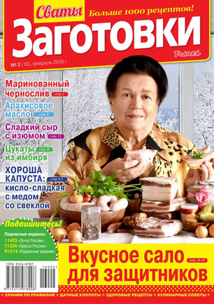 Более 100 рецептов заготовок от Сватов в каждом номере: соленья и маринады, салаты и ассорти, соусы и приправы, заготовки к сезону, сладкие заготовки, напитки, винный погребок, мясные деликатесы, здоровые рецепты, целебные заготовки, дачные хлопоты, правила хранения, а также кроссворды и сканворды для досуга. Лучшими рецептами поделятся с вами сваты Любовь Сергеевна и Михаил Михайлович.