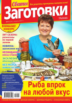Более 100 рецептов заготовок от Сватов в каждом номере: соленья и маринады, салаты и ассорти, соусы и приправы, заготовки к сезону, сладкие заготовки, напитки, винный погребок, мясные деликатесы, здоровые рецепты, целебные заготовки, дачные хлопоты, правила хранения, а также кроссворды и сканворды для досуга. Лучшими рецептами поделятся с вами сваты Любовь Сергеевна и Михаил Михайлович.