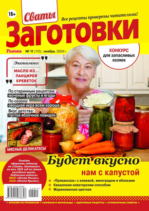 Более 100 рецептов заготовок от Сватов в каждом номере: соленья и маринады, салаты и ассорти, соусы и приправы, заготовки к сезону, сладкие заготовки, напитки, винный погребок, мясные деликатесы, здоровые рецепты, целебные заготовки, дачные хлопоты, правила хранения, а также кроссворды и сканворды для досуга. Лучшими рецептами поделятся с вами сваты Любовь Сергеевна и Михаил Михайлович.