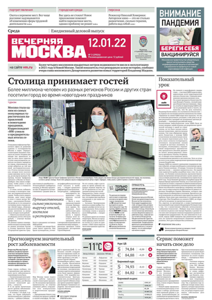 «Вечерняя Москва» — ежедневная российская вечерняя газета, старейшее из вечерних изданий в России, учрежденное в 1923 году. Выходит пять дней в неделю, кроме субботы и воскресенья. Отличается тем, что рассказывает о событиях еще не завершившегося дня. Оперативно освещает хронику и особенности жизни Москвы, охватывает все слои общества и большинство профессиональных и возрастных групп читателей.Издание представлено тремя выпусками – утренним ежедневным, вечерним (выходит три раза в неделю), еженедельным (выходит по четвергам).