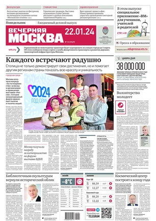 «Вечерняя Москва» — ежедневная российская вечерняя газета, старейшее из вечерних изданий в России, учрежденное в 1923 году. Выходит пять дней в неделю, кроме субботы и воскресенья. Отличается тем, что рассказывает о событиях еще не завершившегося дня. Оперативно освещает хронику и особенности жизни Москвы, охватывает все слои общества и большинство профессиональных и возрастных групп читателей.Издание представлено тремя выпусками – утренним ежедневным, вечерним (выходит три раза в неделю), еженедельным (выходит по четвергам).