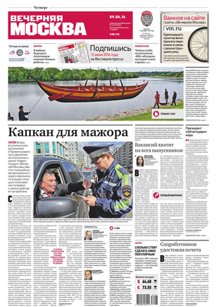 «Вечерняя Москва» — ежедневная российская вечерняя газета, старейшее из вечерних изданий в России, учрежденное в 1923 году. Выходит пять дней в неделю, кроме субботы и воскресенья. Отличается тем, что рассказывает о событиях еще не завершившегося дня. Оперативно освещает хронику и особенности жизни Москвы, охватывает все слои общества и большинство профессиональных и возрастных групп читателей.Издание представлено тремя выпусками – утренним ежедневным, вечерним (выходит три раза в неделю), еженедельным (выходит по четвергам).