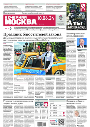 «Вечерняя Москва» — ежедневная российская вечерняя газета, старейшее из вечерних изданий в России, учрежденное в 1923 году. Выходит пять дней в неделю, кроме субботы и воскресенья. Отличается тем, что рассказывает о событиях еще не завершившегося дня. Оперативно освещает хронику и особенности жизни Москвы, охватывает все слои общества и большинство профессиональных и возрастных групп читателей.Издание представлено тремя выпусками – утренним ежедневным, вечерним (выходит три раза в неделю), еженедельным (выходит по четвергам).