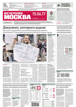 «Вечерняя Москва» — ежедневная российская вечерняя газета, старейшее из вечерних изданий в России, учрежденное в 1923 году. Выходит пять дней в неделю, кроме субботы и воскресенья. Отличается тем, что рассказывает о событиях еще не завершившегося дня. Оперативно освещает хронику и особенности жизни Москвы, охватывает все слои общества и большинство профессиональных и возрастных групп читателей.Издание представлено тремя выпусками – утренним ежедневным, вечерним (выходит три раза в неделю), еженедельным (выходит по четвергам).