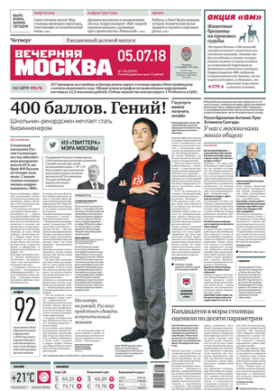 «Вечерняя Москва» — ежедневная российская вечерняя газета, старейшее из вечерних изданий в России, учрежденное в 1923 году. Выходит пять дней в неделю, кроме субботы и воскресенья. Отличается тем, что рассказывает о событиях еще не завершившегося дня. Оперативно освещает хронику и особенности жизни Москвы, охватывает все слои общества и большинство профессиональных и возрастных групп читателей.Издание представлено тремя выпусками – утренним ежедневным, вечерним (выходит три раза в неделю), еженедельным (выходит по четвергам).