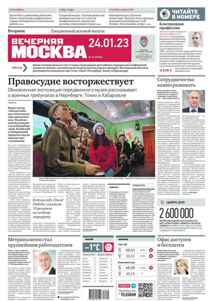 «Вечерняя Москва» — ежедневная российская вечерняя газета, старейшее из вечерних изданий в России, учрежденное в 1923 году. Выходит пять дней в неделю, кроме субботы и воскресенья. Отличается тем, что рассказывает о событиях еще не завершившегося дня. Оперативно освещает хронику и особенности жизни Москвы, охватывает все слои общества и большинство профессиональных и возрастных групп читателей.Издание представлено тремя выпусками – утренним ежедневным, вечерним (выходит три раза в неделю), еженедельным (выходит по четвергам).
