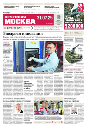 «Вечерняя Москва» — ежедневная российская вечерняя газета, старейшее из вечерних изданий в России, учрежденное в 1923 году. Выходит пять дней в неделю, кроме субботы и воскресенья. Отличается тем, что рассказывает о событиях еще не завершившегося дня. Оперативно освещает хронику и особенности жизни Москвы, охватывает все слои общества и большинство профессиональных и возрастных групп читателей.Издание представлено тремя выпусками – утренним ежедневным, вечерним (выходит три раза в неделю), еженедельным (выходит по четвергам).