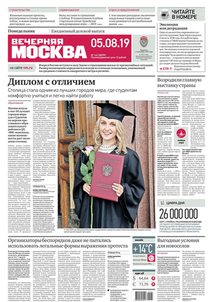 «Вечерняя Москва» — ежедневная российская вечерняя газета, старейшее из вечерних изданий в России, учрежденное в 1923 году. Выходит пять дней в неделю, кроме субботы и воскресенья. Отличается тем, что рассказывает о событиях еще не завершившегося дня. Оперативно освещает хронику и особенности жизни Москвы, охватывает все слои общества и большинство профессиональных и возрастных групп читателей.Издание представлено тремя выпусками – утренним ежедневным, вечерним (выходит три раза в неделю), еженедельным (выходит по четвергам).