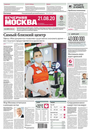 «Вечерняя Москва» — ежедневная российская вечерняя газета, старейшее из вечерних изданий в России, учрежденное в 1923 году. Выходит пять дней в неделю, кроме субботы и воскресенья. Отличается тем, что рассказывает о событиях еще не завершившегося дня. Оперативно освещает хронику и особенности жизни Москвы, охватывает все слои общества и большинство профессиональных и возрастных групп читателей.Издание представлено тремя выпусками – утренним ежедневным, вечерним (выходит три раза в неделю), еженедельным (выходит по четвергам).
