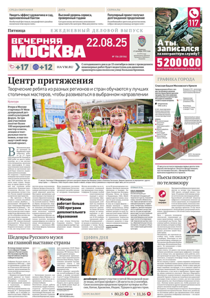 «Вечерняя Москва» — ежедневная российская вечерняя газета, старейшее из вечерних изданий в России, учрежденное в 1923 году. Выходит пять дней в неделю, кроме субботы и воскресенья. Отличается тем, что рассказывает о событиях еще не завершившегося дня. Оперативно освещает хронику и особенности жизни Москвы, охватывает все слои общества и большинство профессиональных и возрастных групп читателей.Издание представлено тремя выпусками – утренним ежедневным, вечерним (выходит три раза в неделю), еженедельным (выходит по четвергам).