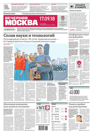 «Вечерняя Москва» — ежедневная российская вечерняя газета, старейшее из вечерних изданий в России, учрежденное в 1923 году. Выходит пять дней в неделю, кроме субботы и воскресенья. Отличается тем, что рассказывает о событиях еще не завершившегося дня. Оперативно освещает хронику и особенности жизни Москвы, охватывает все слои общества и большинство профессиональных и возрастных групп читателей.Издание представлено тремя выпусками – утренним ежедневным, вечерним (выходит три раза в неделю), еженедельным (выходит по четвергам).