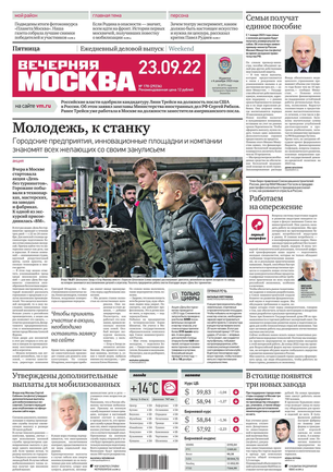 «Вечерняя Москва» — ежедневная российская вечерняя газета, старейшее из вечерних изданий в России, учрежденное в 1923 году. Выходит пять дней в неделю, кроме субботы и воскресенья. Отличается тем, что рассказывает о событиях еще не завершившегося дня. Оперативно освещает хронику и особенности жизни Москвы, охватывает все слои общества и большинство профессиональных и возрастных групп читателей.Издание представлено тремя выпусками – утренним ежедневным, вечерним (выходит три раза в неделю), еженедельным (выходит по четвергам).