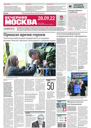 «Вечерняя Москва» — ежедневная российская вечерняя газета, старейшее из вечерних изданий в России, учрежденное в 1923 году. Выходит пять дней в неделю, кроме субботы и воскресенья. Отличается тем, что рассказывает о событиях еще не завершившегося дня. Оперативно освещает хронику и особенности жизни Москвы, охватывает все слои общества и большинство профессиональных и возрастных групп читателей.Издание представлено тремя выпусками – утренним ежедневным, вечерним (выходит три раза в неделю), еженедельным (выходит по четвергам).