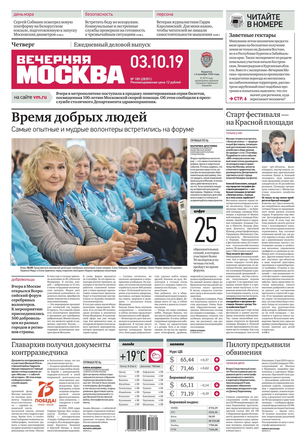 «Вечерняя Москва» — ежедневная российская вечерняя газета, старейшее из вечерних изданий в России, учрежденное в 1923 году. Выходит пять дней в неделю, кроме субботы и воскресенья. Отличается тем, что рассказывает о событиях еще не завершившегося дня. Оперативно освещает хронику и особенности жизни Москвы, охватывает все слои общества и большинство профессиональных и возрастных групп читателей.Издание представлено тремя выпусками – утренним ежедневным, вечерним (выходит три раза в неделю), еженедельным (выходит по четвергам).