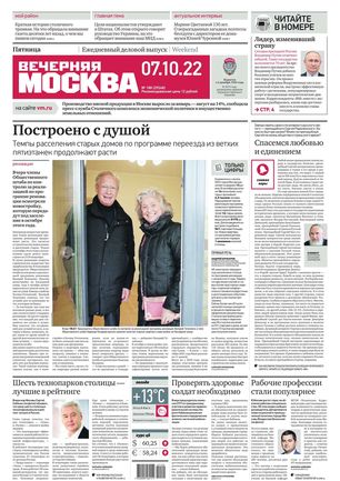 «Вечерняя Москва» — ежедневная российская вечерняя газета, старейшее из вечерних изданий в России, учрежденное в 1923 году. Выходит пять дней в неделю, кроме субботы и воскресенья. Отличается тем, что рассказывает о событиях еще не завершившегося дня. Оперативно освещает хронику и особенности жизни Москвы, охватывает все слои общества и большинство профессиональных и возрастных групп читателей.Издание представлено тремя выпусками – утренним ежедневным, вечерним (выходит три раза в неделю), еженедельным (выходит по четвергам).