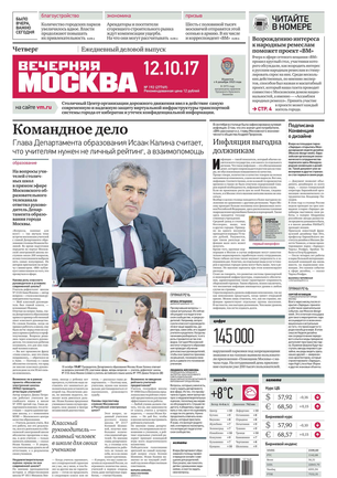«Вечерняя Москва» — ежедневная российская вечерняя газета, старейшее из вечерних изданий в России, учрежденное в 1923 году. Выходит пять дней в неделю, кроме субботы и воскресенья. Отличается тем, что рассказывает о событиях еще не завершившегося дня. Оперативно освещает хронику и особенности жизни Москвы, охватывает все слои общества и большинство профессиональных и возрастных групп читателей.Издание представлено тремя выпусками – утренним ежедневным, вечерним (выходит три раза в неделю), еженедельным (выходит по четвергам).