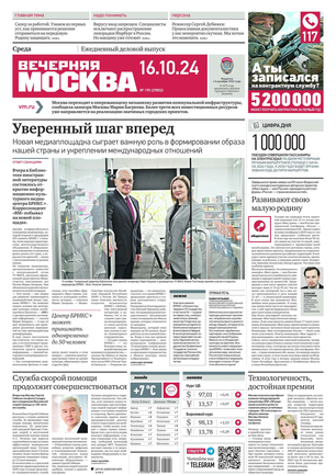 «Вечерняя Москва» — ежедневная российская вечерняя газета, старейшее из вечерних изданий в России, учрежденное в 1923 году. Выходит пять дней в неделю, кроме субботы и воскресенья. Отличается тем, что рассказывает о событиях еще не завершившегося дня. Оперативно освещает хронику и особенности жизни Москвы, охватывает все слои общества и большинство профессиональных и возрастных групп читателей.Издание представлено тремя выпусками – утренним ежедневным, вечерним (выходит три раза в неделю), еженедельным (выходит по четвергам).