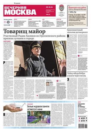 «Вечерняя Москва» — ежедневная российская вечерняя газета, старейшее из вечерних изданий в России, учрежденное в 1923 году. Выходит пять дней в неделю, кроме субботы и воскресенья. Отличается тем, что рассказывает о событиях еще не завершившегося дня. Оперативно освещает хронику и особенности жизни Москвы, охватывает все слои общества и большинство профессиональных и возрастных групп читателей.Издание представлено тремя выпусками – утренним ежедневным, вечерним (выходит три раза в неделю), еженедельным (выходит по четвергам).