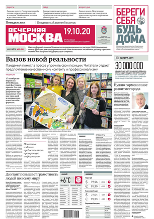 «Вечерняя Москва» — ежедневная российская вечерняя газета, старейшее из вечерних изданий в России, учрежденное в 1923 году. Выходит пять дней в неделю, кроме субботы и воскресенья. Отличается тем, что рассказывает о событиях еще не завершившегося дня. Оперативно освещает хронику и особенности жизни Москвы, охватывает все слои общества и большинство профессиональных и возрастных групп читателей.Издание представлено тремя выпусками – утренним ежедневным, вечерним (выходит три раза в неделю), еженедельным (выходит по четвергам).