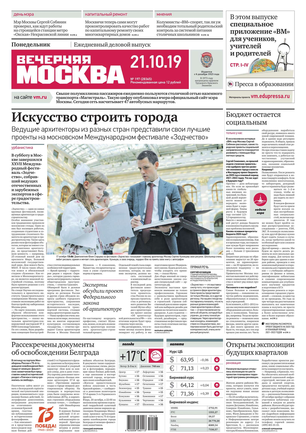 «Вечерняя Москва» — ежедневная российская вечерняя газета, старейшее из вечерних изданий в России, учрежденное в 1923 году. Выходит пять дней в неделю, кроме субботы и воскресенья. Отличается тем, что рассказывает о событиях еще не завершившегося дня. Оперативно освещает хронику и особенности жизни Москвы, охватывает все слои общества и большинство профессиональных и возрастных групп читателей.Издание представлено тремя выпусками – утренним ежедневным, вечерним (выходит три раза в неделю), еженедельным (выходит по четвергам).