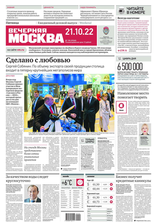«Вечерняя Москва» — ежедневная российская вечерняя газета, старейшее из вечерних изданий в России, учрежденное в 1923 году. Выходит пять дней в неделю, кроме субботы и воскресенья. Отличается тем, что рассказывает о событиях еще не завершившегося дня. Оперативно освещает хронику и особенности жизни Москвы, охватывает все слои общества и большинство профессиональных и возрастных групп читателей.Издание представлено тремя выпусками – утренним ежедневным, вечерним (выходит три раза в неделю), еженедельным (выходит по четвергам).