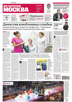 «Вечерняя Москва» — ежедневная российская вечерняя газета, старейшее из вечерних изданий в России, учрежденное в 1923 году. Выходит пять дней в неделю, кроме субботы и воскресенья. Отличается тем, что рассказывает о событиях еще не завершившегося дня. Оперативно освещает хронику и особенности жизни Москвы, охватывает все слои общества и большинство профессиональных и возрастных групп читателей.Издание представлено тремя выпусками – утренним ежедневным, вечерним (выходит три раза в неделю), еженедельным (выходит по четвергам).