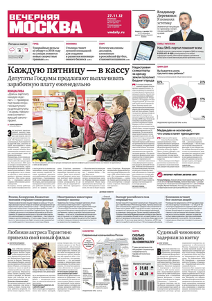 «Вечерняя Москва» — ежедневная российская вечерняя газета, старейшее из вечерних изданий в России, учрежденное в 1923 году. Выходит пять дней в неделю, кроме субботы и воскресенья. Отличается тем, что рассказывает о событиях еще не завершившегося дня. Оперативно освещает хронику и особенности жизни Москвы, охватывает все слои общества и большинство профессиональных и возрастных групп читателей.Издание представлено тремя выпусками – утренним ежедневным, вечерним (выходит три раза в неделю), еженедельным (выходит по четвергам).