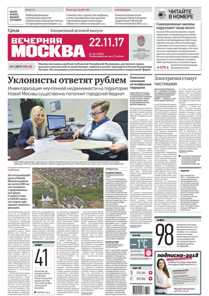«Вечерняя Москва» — ежедневная российская вечерняя газета, старейшее из вечерних изданий в России, учрежденное в 1923 году. Выходит пять дней в неделю, кроме субботы и воскресенья. Отличается тем, что рассказывает о событиях еще не завершившегося дня. Оперативно освещает хронику и особенности жизни Москвы, охватывает все слои общества и большинство профессиональных и возрастных групп читателей.Издание представлено тремя выпусками – утренним ежедневным, вечерним (выходит три раза в неделю), еженедельным (выходит по четвергам).