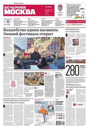 «Вечерняя Москва» — ежедневная российская вечерняя газета, старейшее из вечерних изданий в России, учрежденное в 1923 году. Выходит пять дней в неделю, кроме субботы и воскресенья. Отличается тем, что рассказывает о событиях еще не завершившегося дня. Оперативно освещает хронику и особенности жизни Москвы, охватывает все слои общества и большинство профессиональных и возрастных групп читателей.Издание представлено тремя выпусками – утренним ежедневным, вечерним (выходит три раза в неделю), еженедельным (выходит по четвергам).