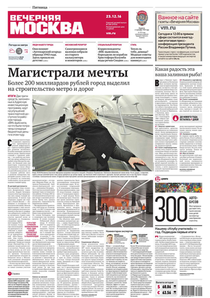 «Вечерняя Москва» — ежедневная российская вечерняя газета, старейшее из вечерних изданий в России, учрежденное в 1923 году. Выходит пять дней в неделю, кроме субботы и воскресенья. Отличается тем, что рассказывает о событиях еще не завершившегося дня. Оперативно освещает хронику и особенности жизни Москвы, охватывает все слои общества и большинство профессиональных и возрастных групп читателей.Издание представлено тремя выпусками – утренним ежедневным, вечерним (выходит три раза в неделю), еженедельным (выходит по четвергам).
