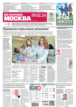 «Вечерняя Москва» — ежедневная российская вечерняя газета, старейшее из вечерних изданий в России, учрежденное в 1923 году. Выходит пять дней в неделю, кроме субботы и воскресенья. Отличается тем, что рассказывает о событиях еще не завершившегося дня. Оперативно освещает хронику и особенности жизни Москвы, охватывает все слои общества и большинство профессиональных и возрастных групп читателей.Издание представлено тремя выпусками – утренним ежедневным, вечерним (выходит три раза в неделю), еженедельным (выходит по четвергам).
