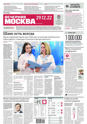 «Вечерняя Москва» — ежедневная российская вечерняя газета, старейшее из вечерних изданий в России, учрежденное в 1923 году. Выходит пять дней в неделю, кроме субботы и воскресенья. Отличается тем, что рассказывает о событиях еще не завершившегося дня. Оперативно освещает хронику и особенности жизни Москвы, охватывает все слои общества и большинство профессиональных и возрастных групп читателей.Издание представлено тремя выпусками – утренним ежедневным, вечерним (выходит три раза в неделю), еженедельным (выходит по четвергам).