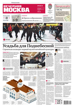 «Вечерняя Москва» — ежедневная российская вечерняя газета, старейшее из вечерних изданий в России, учрежденное в 1923 году. Выходит пять дней в неделю, кроме субботы и воскресенья. Отличается тем, что рассказывает о событиях еще не завершившегося дня. Оперативно освещает хронику и особенности жизни Москвы, охватывает все слои общества и большинство профессиональных и возрастных групп читателей.Издание представлено тремя выпусками – утренним ежедневным, вечерним (выходит три раза в неделю), еженедельным (выходит по четвергам).