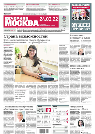 «Вечерняя Москва» — ежедневная российская вечерняя газета, старейшее из вечерних изданий в России, учрежденное в 1923 году. Выходит пять дней в неделю, кроме субботы и воскресенья. Отличается тем, что рассказывает о событиях еще не завершившегося дня. Оперативно освещает хронику и особенности жизни Москвы, охватывает все слои общества и большинство профессиональных и возрастных групп читателей.Издание представлено тремя выпусками – утренним ежедневным, вечерним (выходит три раза в неделю), еженедельным (выходит по четвергам).